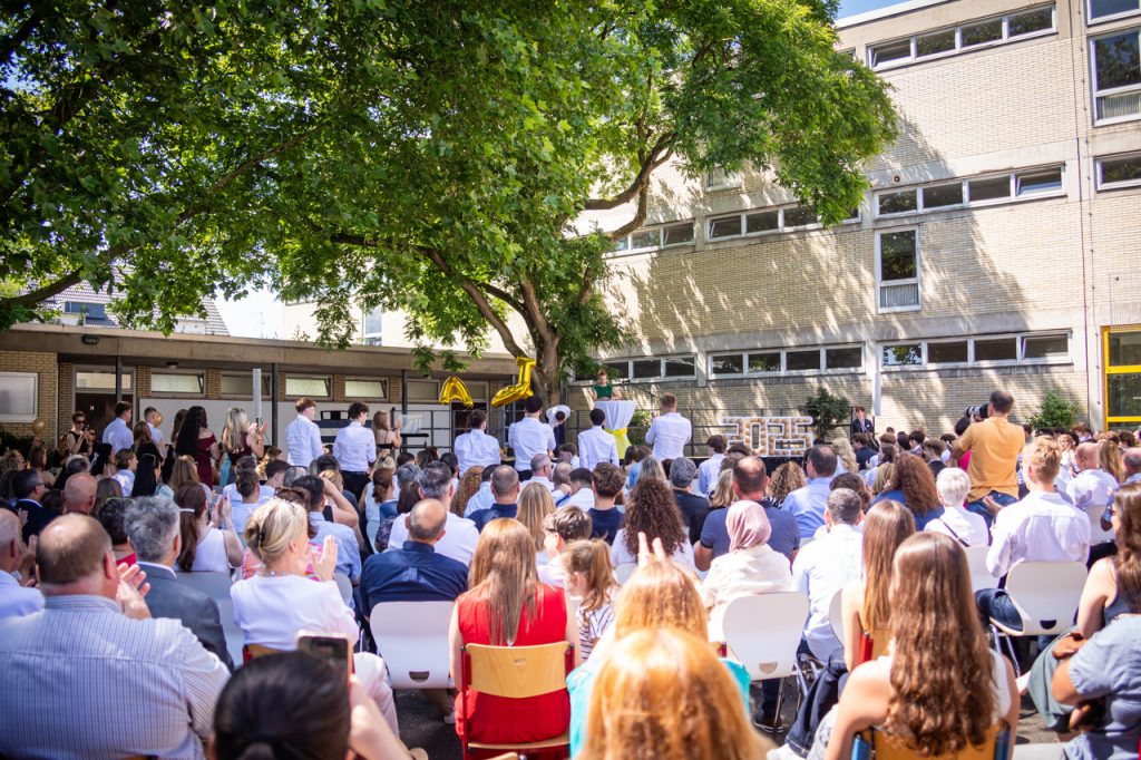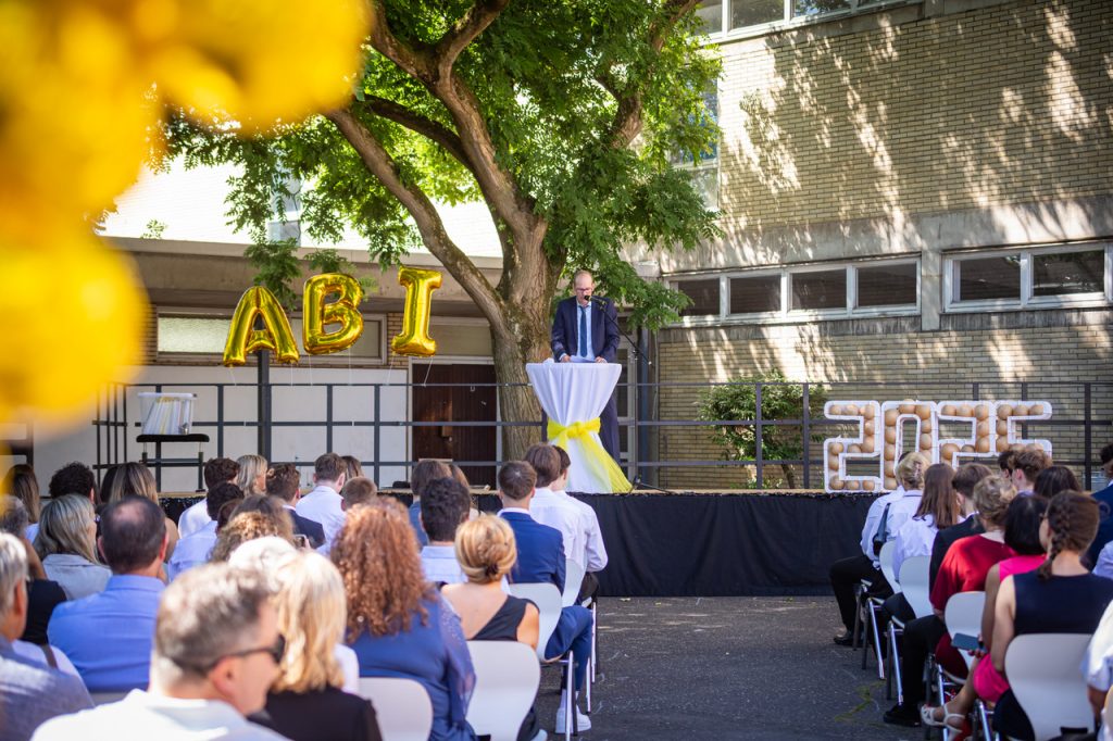 Am 28.06.2025 fand die feierliche Abiturzeugnisverleihung des Gymnasiums Frechen erstmalig unter freiem Himmel auf unserem T-Hof statt. Bei strahlendem Sonnenschein erhielten unsere Abiturientinnen und Abiturienten in festlichem Rahmen ihre lang ersehnten Zeugnisse. Musikalische Beiträge sorgten für eine stimmungsvolle Atmosphäre und machten die Veranstaltung zu einem besonderen Moment für alle Anwesenden.
