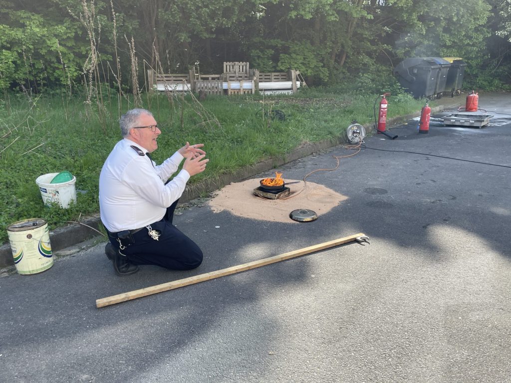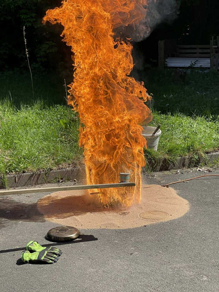 Nach diesem theoretischen Teil und nachdem alle Fragenunserer Klasse geklärt wurden, gingen wir gemeinsam runter auf den Schulhof und durften selbst einmal herausfinden, wie es ist, einen Brand zu löschen. Jetzt wissen wir, wie wir uns im Notfall richtig verhalten müssen. 8 Schüler und Schülerinnen hatten die Aufgabe einen Flüssigkeitsbrand mit verschiedenen Feuerlöschern (z. B. mit Wasser, Schaum und Pulver) zu löschen. Besonders beeindruckend war es, als Herr Roth demonstrierte, was passiert, wenn man einen Fettbrand mit nur sehr wenig Wasser versucht zu löschen. Die riesige Stichflamme hat uns fasziniert. Hier wurde deutlich, dass man einen Fettbrand niemals mit Wasser löschen darf, sondern die Flammen z. B. mit einem Deckel ersticken soll.