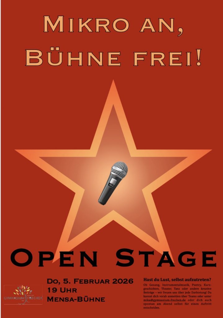 Gesang, Lesung, Tanz? Was genau beim Open-Stage passieren wird, ist vorher nie bekannt. Aber sicherlich wird es wieder ein besonderer Abend – präsentiert von Schülerinnen, Schülern und Lehrkräften unserer Schule. Der zweite Open-Stage-Abend findet am Donnerstag, den 05.02.2026, um 19 Uhr auf der Mensabühne statt und wieder werden Mikrofon und Bühne in positiver und ungezwungener Atmosphäre für alle offenstehen.